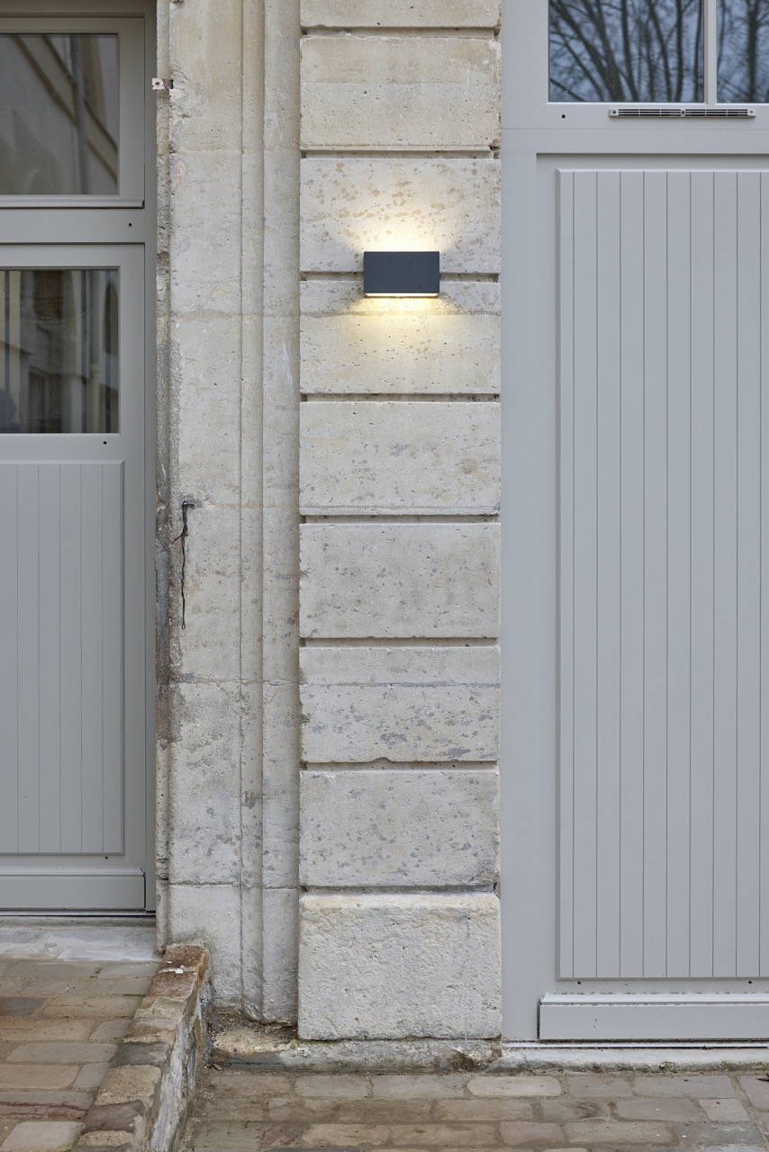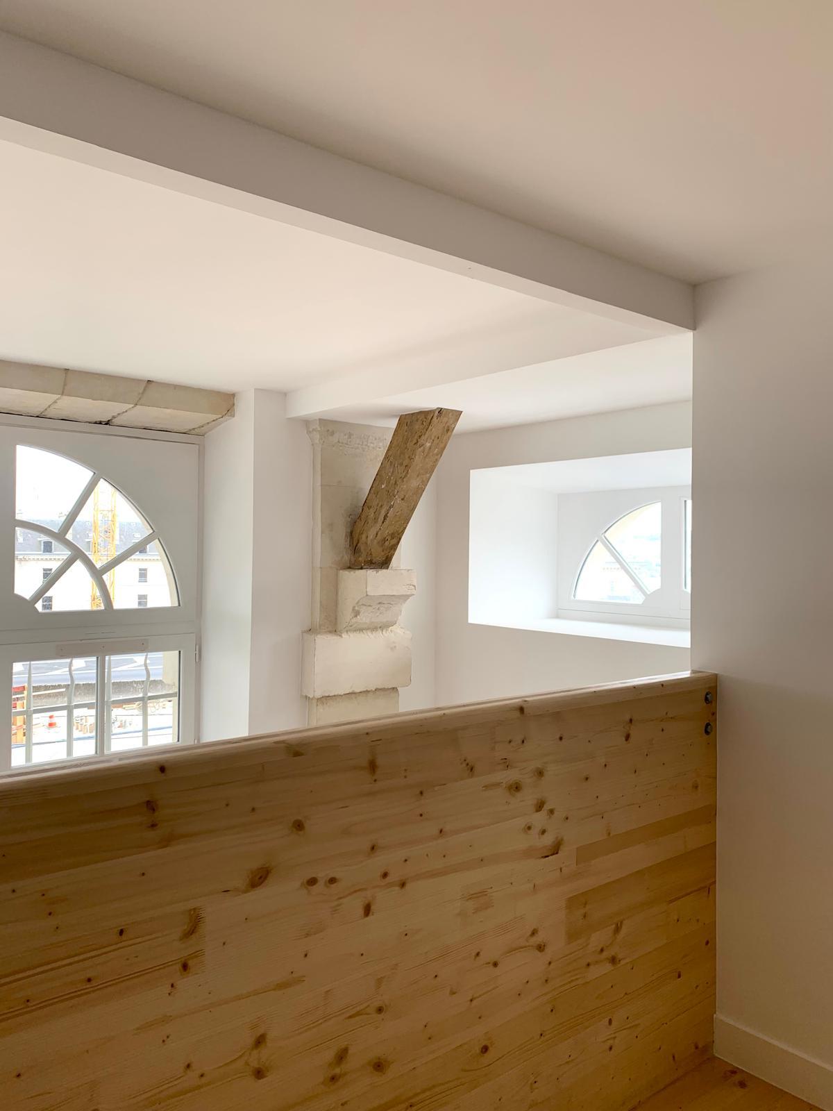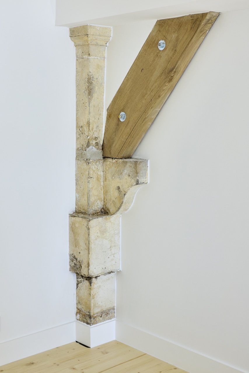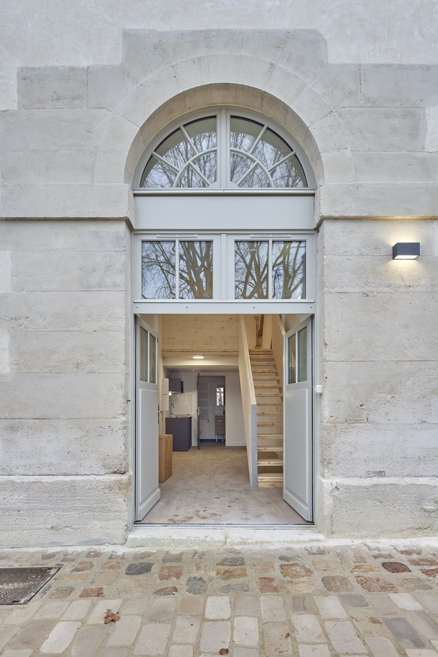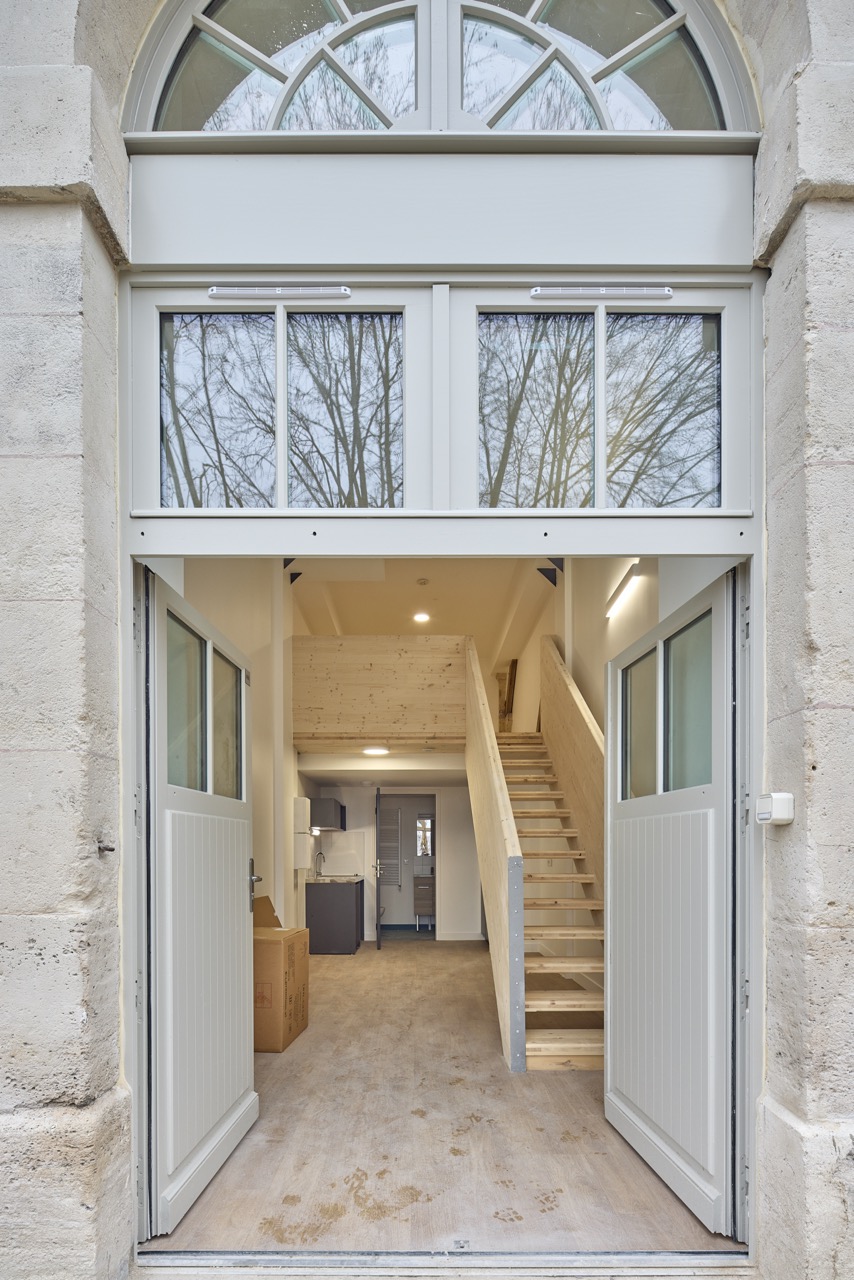 Les équipements des anciennes écuries ont vu leurs usages se transformer : les mangeoires servent de porte-bagage, les impostes cintrées deviennent des appliques lumineuses, les vantaux de fenêtres sont habillées de vitrophanie pour servir de portes de placard et les cloisons barreaudées des box de chevaux ont été déplacées pour accueillir des espaces de travail.