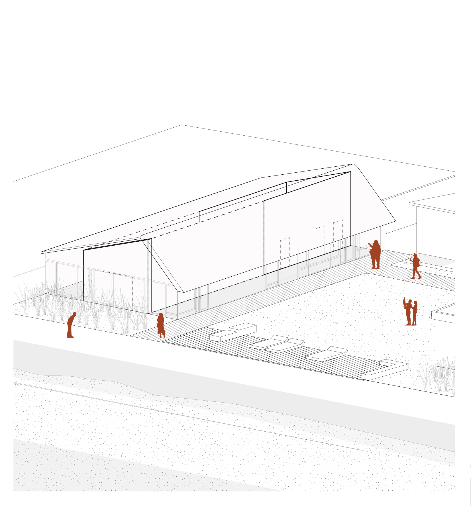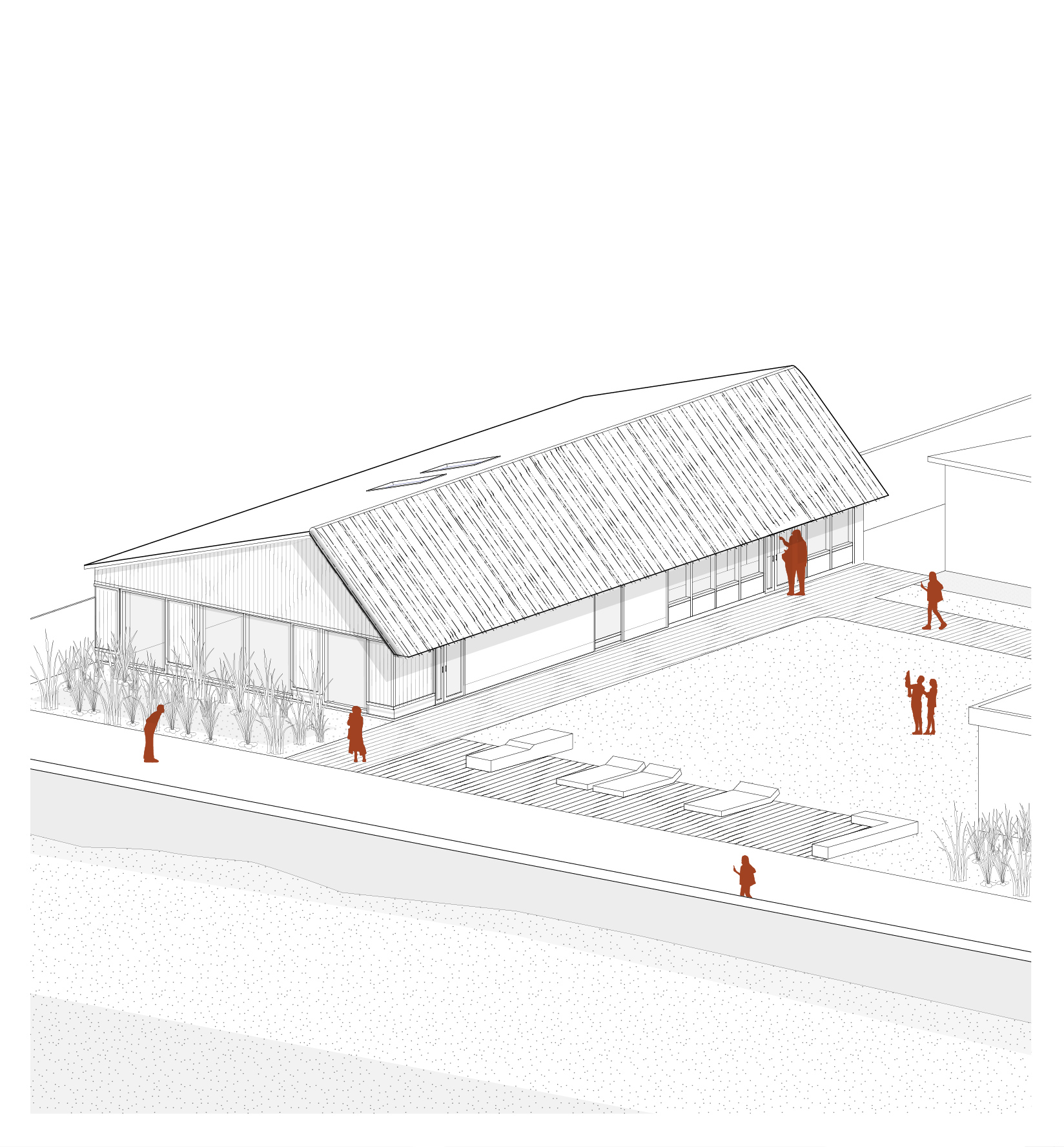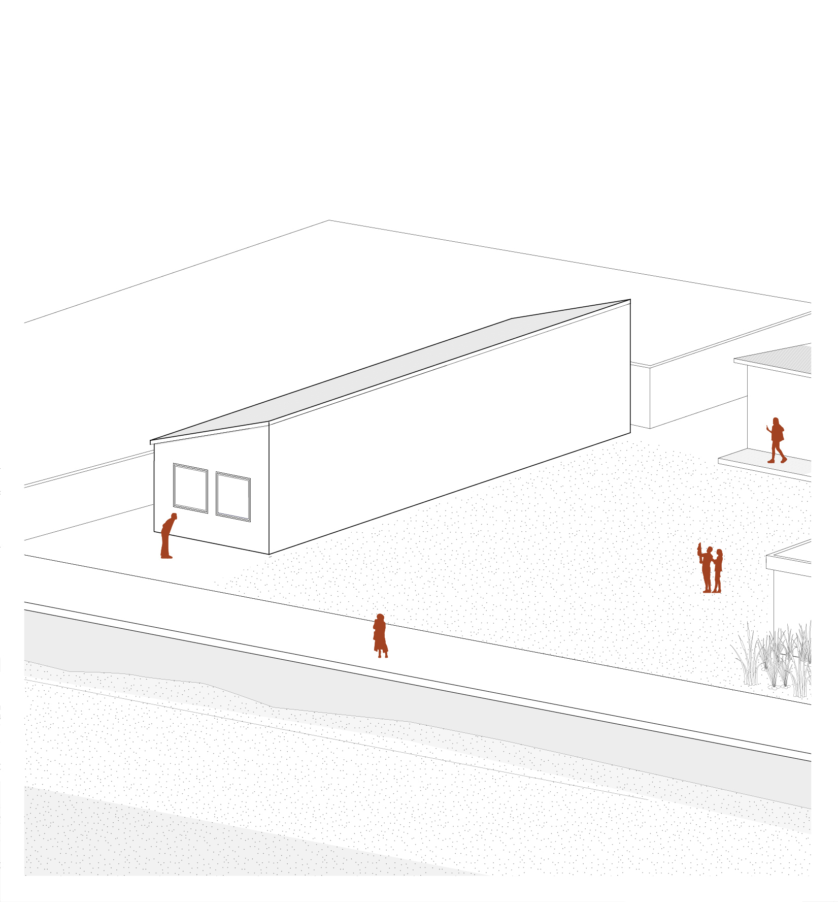 La structure existante, en parpaing, est autant que possible, conservée. Les espaces techniques, servants l’activité de la salle, sont regroupés dans le volume existant sur lequel les interventions sont limitées au stricte nécessaire. La salle polyvalente prend place dans une extension en ossature bois et isolation paille, dont le volume, plus ample, est adapté au programme. L’ensemble est réuni par une grande couverture en chaume local qui habille le bâtiment et offre un nouveau signal visible depuis la digue.